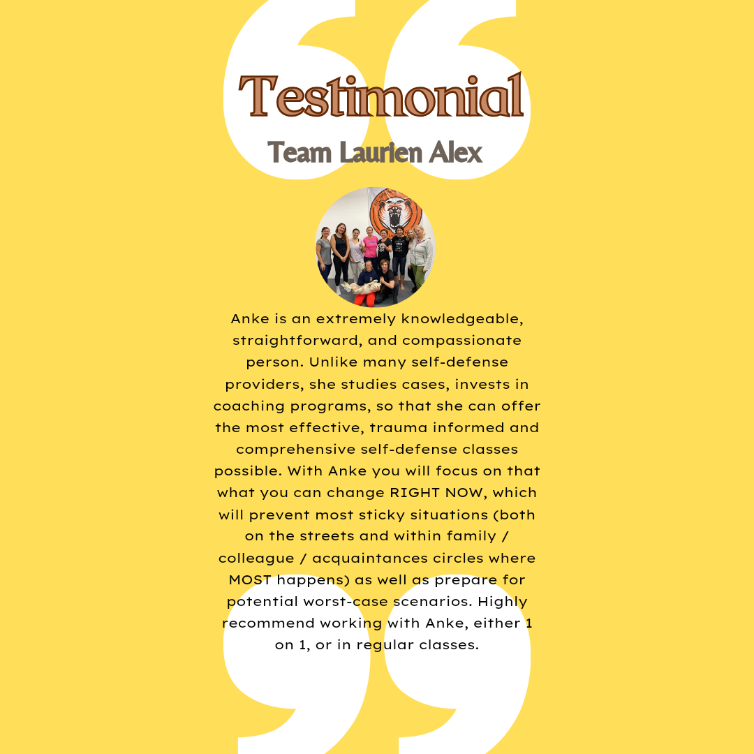Anke is an extremely knowledgeable, straightforward and compassionate person. Unlike many self-defense providers, she studies cases, invests in coaching programms, so that she can offer the most effective, trauma informed and comprehensive self-defense classes possible. With Anke you will focus on what you can change RIGHT NOW, which will prevent most sticky situations (both on the street and with family / collegue / aquaintances circles where MOST happens) as well as prepare for potential worst case scenario. Highly recommend working with Anke, either 1 on 1 or in regular classes.