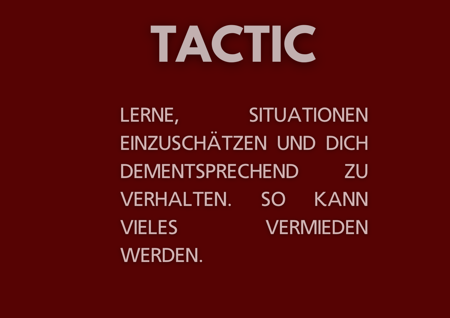 Situationen richtig einzuschätzen und zu verstehen, warum und wie es zu gewalttätigen Handlungen bei einer anderen Person kommen kann ist die Basis von meinem Programm "Stay Safe" (Gewaltprävention/ Deeskalation/ Eigensicherung). Im Vordergrund steht hierbei der Faktor Mensch: ich möchte in der Lage sein, sowohl mich als auch die andere Person bestmöglichst einzuschätzen, um die Situation gewaltfrei lösen zu können.